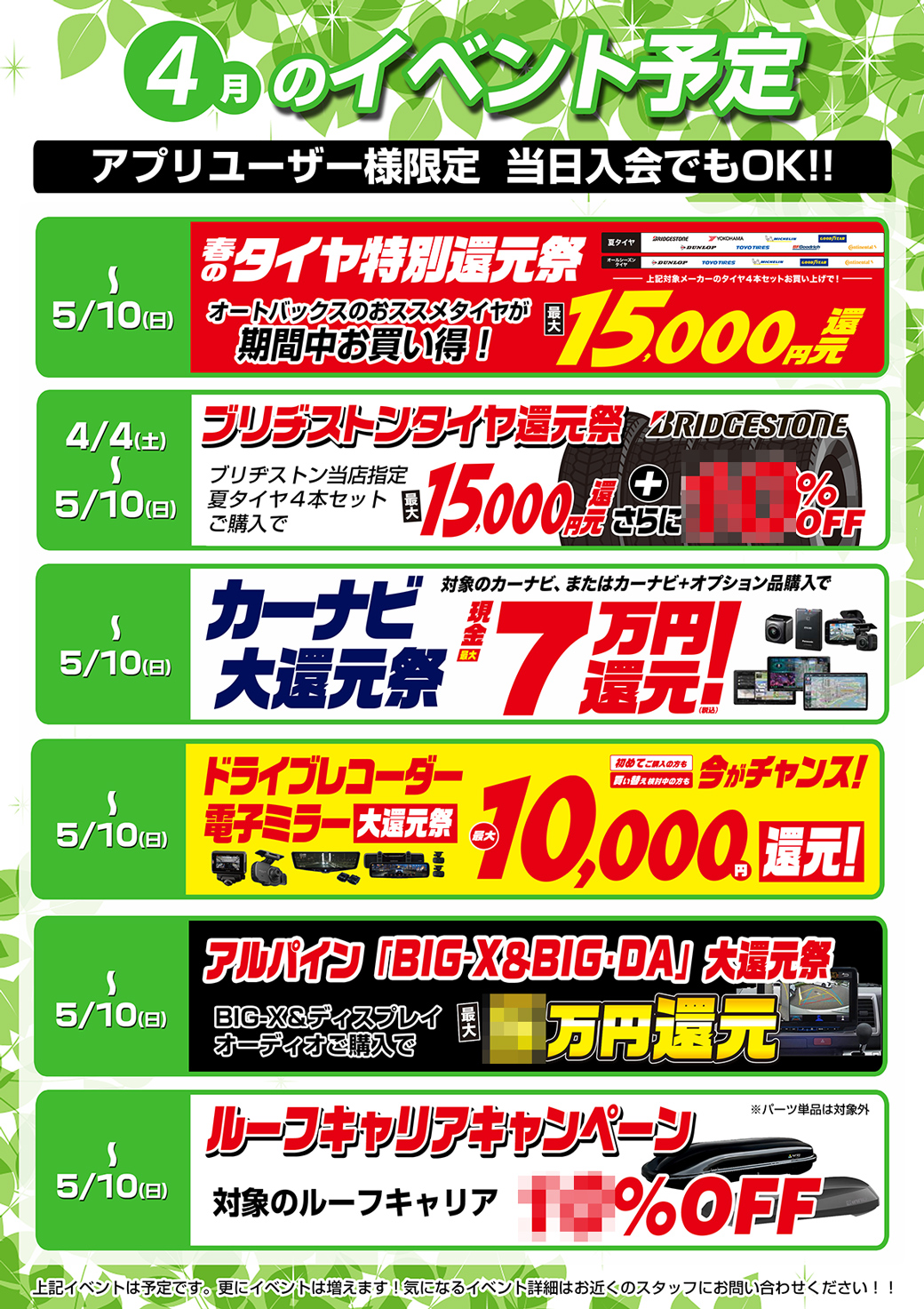 4月のイベント情報 2026年4月7日 ☘️ 4月のイベント情報です! ☘️ イベント・キャンペーン記事一覧に戻る 最近の投稿 4月のイベント情報 春の夏タイヤ大還元祭【3/6~5/10】 3月のイベント情報 ドラレコ最大1万円大還元祭【2/20~5/10】 ドラレコ最大1万円大還元祭【2/20~5/10】 アーカイブ 月別アーカイブ 2026年4月 [1] 2026年3月 [1] 2026年2月 [6] 2026年1月 [1] 2025年12月 [4] 2025年10月 [4] 2025年9月 [1] 2025年8月 [1] 2025年7月 [2] 2025年6月 [4] 2025年5月 [3] 2023年7月 [1] キーワード検索 検索 Tag Cloud ETCETC2.0オートバックスオートバックス ブリヂストン ヨコハマタイヤ ダンロップ パイオニア パナソニック ケンウッド アルパイン 暑い 夏 快適助成キャンペーン